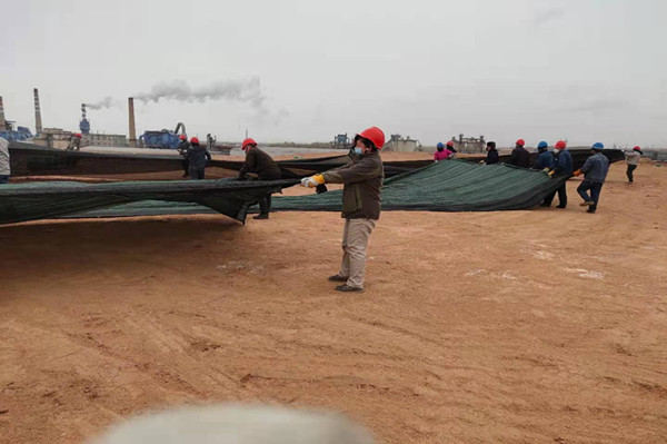 由于公司電石泥堆場(chǎng)地更換為新原料堆場(chǎng)造成的部分土地裸露,造成揚(yáng)塵污染,治風(fēng)沙、阻揚(yáng)塵這項(xiàng)工作迫在眉睫;初冬的天氣冷風(fēng)呼啦啦掃動(dòng)著滿地的枯葉紙屑,濃黑的云像一團(tuán)團(tuán)破絮,倒懸在我們的上空,北風(fēng)呼呼那個(gè)吹,任憑它的怎么肆虐卻擊退不了職工們工作的熱情,瞧他們單膝蓋在潮濕的泥土上細(xì)心的用鐵絲鏈接著每個(gè)接口。男職工展現(xiàn)大力水手的魅力,兩人一卷,一人一卷有序的擺放在裸露的土地中央,女同事也不甘示弱拆開(kāi)整卷防塵網(wǎng)整齊的鋪在砂石頂部,大家喊著整齊的口號(hào),經(jīng)過(guò)一早上不懈努力,就將整個(gè)原料場(chǎng)地覆蓋完畢。既抑制滿天風(fēng)沙的場(chǎng)景,也保存了大量的原料被風(fēng)帶走,造成原料損耗。