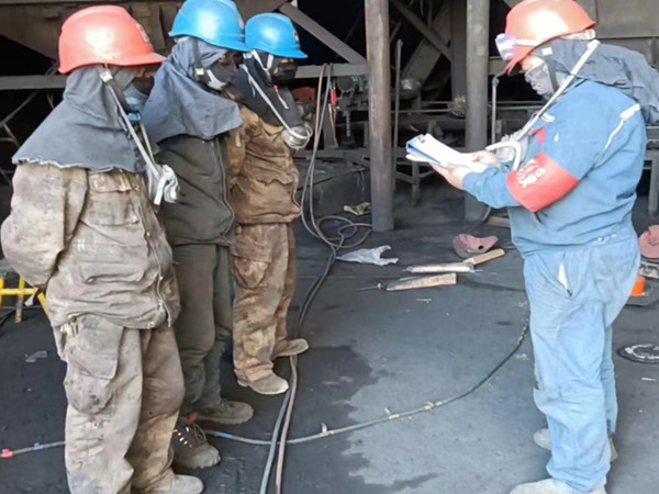 檢修窯內(nèi)工作項目中為避免搬窯磚過程中造成手中窯磚掉落砸傷人員腳的安全隱患,他們有序地排成兩排。