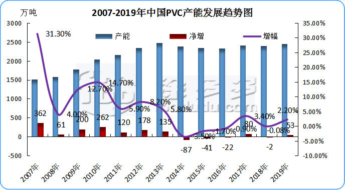 2.1 2007年-2019年中國聚氯乙烯產(chǎn)能走勢圖