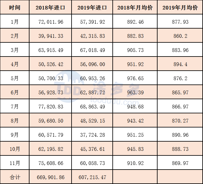 2019年1-11月累計(jì)進(jìn)口數(shù)量為607215.47噸,同比去年減少62686.39噸。跌幅9.36%,國內(nèi)產(chǎn)能供給充裕,進(jìn)口量大幅下跌。