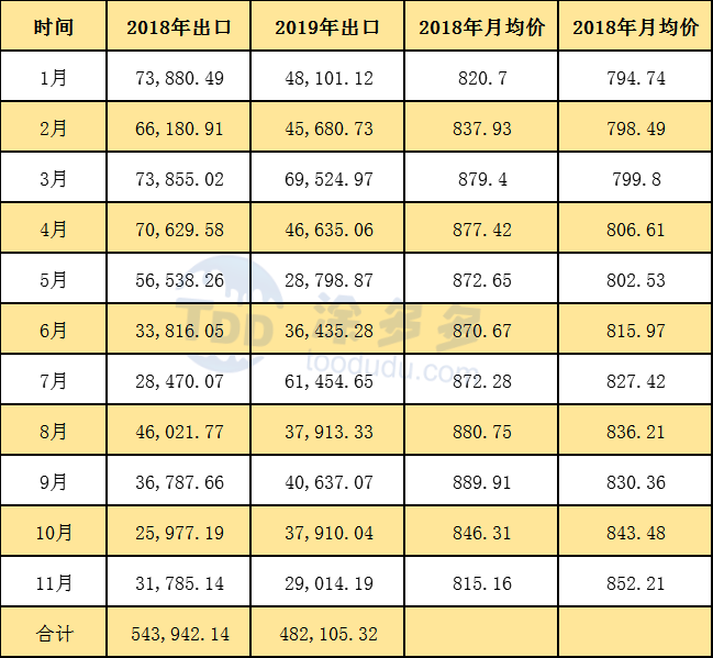 2019年1-11月累計(jì)出口數(shù)量為482105.32噸,同比去年減少61836.82噸。跌幅11.37%,進(jìn)出口抵消來看,國內(nèi)市場供需變化不大。出口數(shù)量的減少彌補(bǔ)了進(jìn)口的減少。