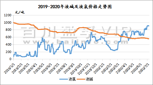 今年氯堿綜合利潤(rùn)不高,燒堿盈利微薄,且局部地區(qū)始終倒掛,“以氯補(bǔ)堿”的情況比較明顯。我們將主產(chǎn)區(qū)山東、江蘇槽車(chē)出貨價(jià)格進(jìn)行分析發(fā)現(xiàn):2020年山東地區(qū)液氯價(jià)格保持在500-800元/噸調(diào)整,500元/噸基本為山東液氯托底價(jià)格。2020年1-6月份山東地區(qū)液氯槽車(chē)出貨均價(jià)為487.09元/噸,同比2019年山東地區(qū)液氯槽車(chē)出貨均價(jià)82.3元/噸上漲491.84%。而江蘇地區(qū)液氯出貨價(jià)格在350-800元/噸之間調(diào)整,350元/噸基本為江蘇液氯托底價(jià)格。2020年1-6月份江蘇地區(qū)液氯槽車(chē)出貨均價(jià)為603.3元/噸同比2019年江蘇地區(qū)液氯槽車(chē)出貨均價(jià)229.4元/噸上漲162.99%。