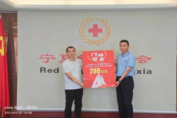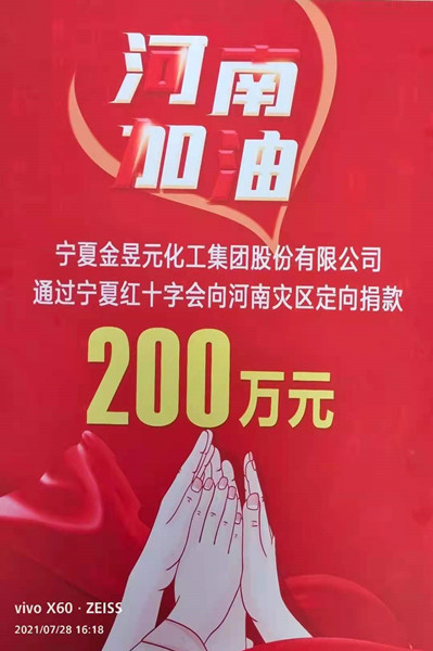 洪災(zāi)無(wú)情,人間有愛(ài)。7月28日,寧夏金昱元化工集團(tuán)股份有限公司委托寧夏紅十字會(huì)向河南災(zāi)區(qū)捐助二百萬(wàn)元,馳援河南受災(zāi)地區(qū),表達(dá)對(duì)災(zāi)區(qū)人民的深切問(wèn)候。