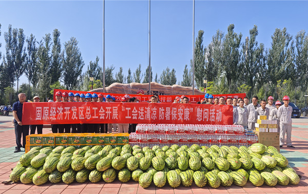 當青銅峽市委、政府和固原經(jīng)濟開發(fā)區(qū)總工會的領導為金昱元股份公司奮戰(zhàn)在生產一線的員工們送上西瓜、飲料、茶葉、冰糖等防暑物品的時候,廣大員工對上級政府部門領導的關心和厚愛深表感謝。炎炎夏日,上級政府部門送來的關愛使員工們如沐春風,深受感動。